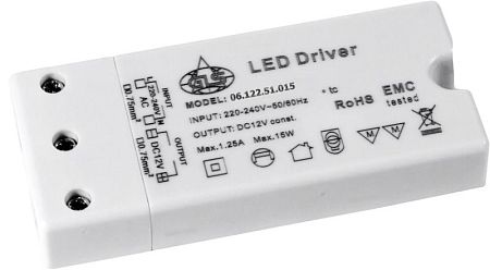 Блок питания для LED max 15Вт, AC220В/DC12В, пласт. корп., IP20, 97,5х42х16мм