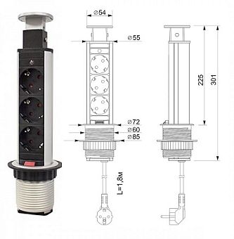 Блок розеток выдвижной круг. d60мм, 16А, 3 поста, серебр., провод 1,8м с вилкой
