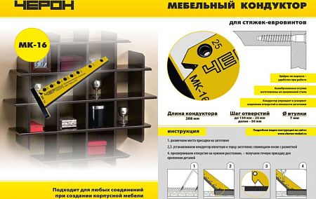 МК-16 Кондуктор мебельный "угольник" для евровинтов, длина 288мм, шаг 25/50мм, d втулки 7мм