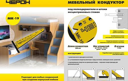 МК-19 Мебельный кондуктор "угольник" для полкодерж., длина 288мм, шаг 25/50, d втулки 5мм