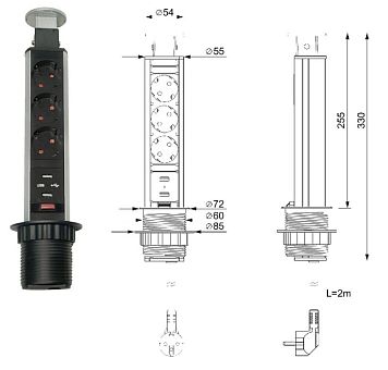 Блок розеток выдвижной круг. d60мм, 16А, 3 поста, 2USB, серебр., провод 1,8м с вилкой