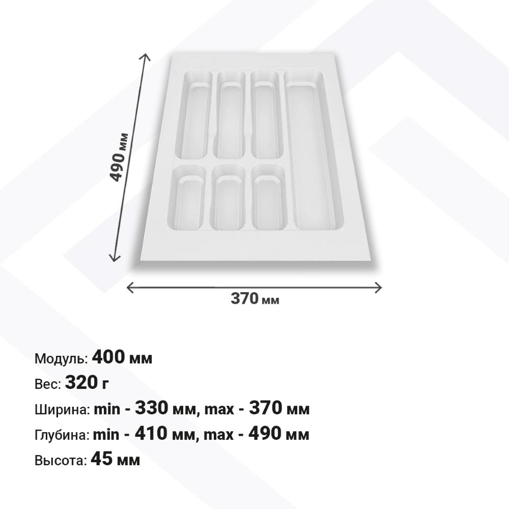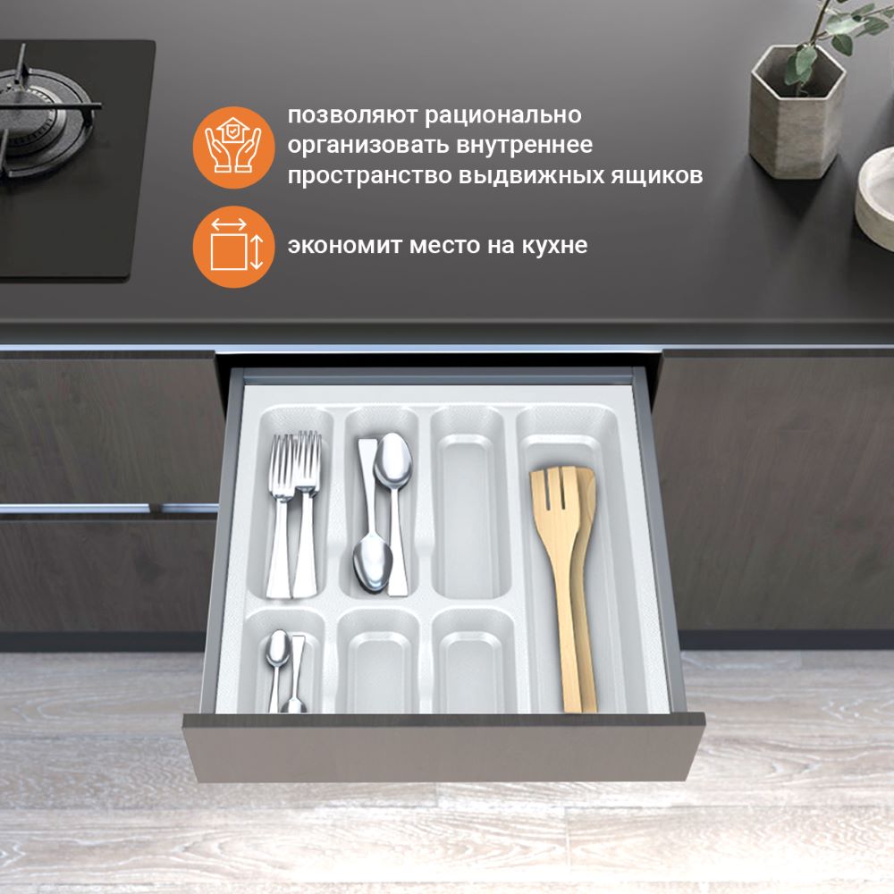Лотки для столовых приборов EVA позволяют рационально организовать внутреннее пространство выдвижных ящиков. Цвета: серый и белый глянец. Для ящиков шириной 400 мм.