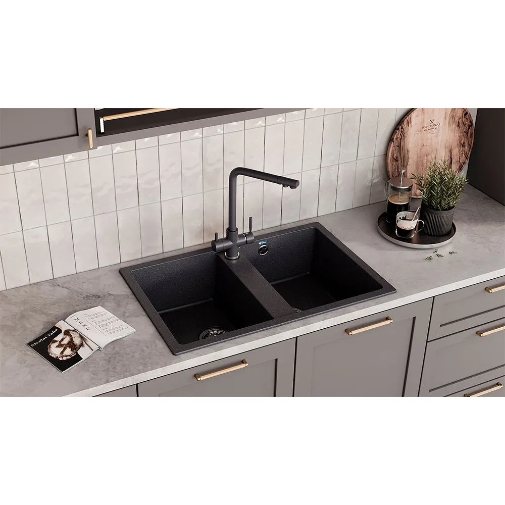 ULGRAN U-608 – двухсекционная кухонная мойка с отверстием под смеситель и двумя вместительными чашами. Данная мойка устанавливается в шкаф шириной от 80 см.