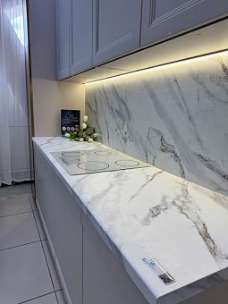 Золотые прожилки в сочетании с крупной натуральной фактурой декора Мрамор Саяны позволят каждому найти именно свое элегантное решение в дизайне интерьера кухни.